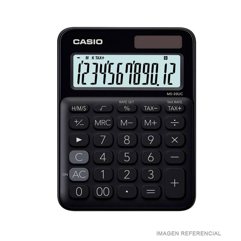 La Casio MS-20UC en color negro es la elección clásica y sobria dentro de la colección My Style. Su acabado mate de alta calidad aporta un toque de elegancia y profesionalismo a cualquier escritorio o mostrador. Esta calculadora de mini-escritorio ofrece todas las prestaciones profesionales de Casio en un cuerpo compacto y resistente, perfecto para el uso diario intenso en oficinas, comercios o el hogar.