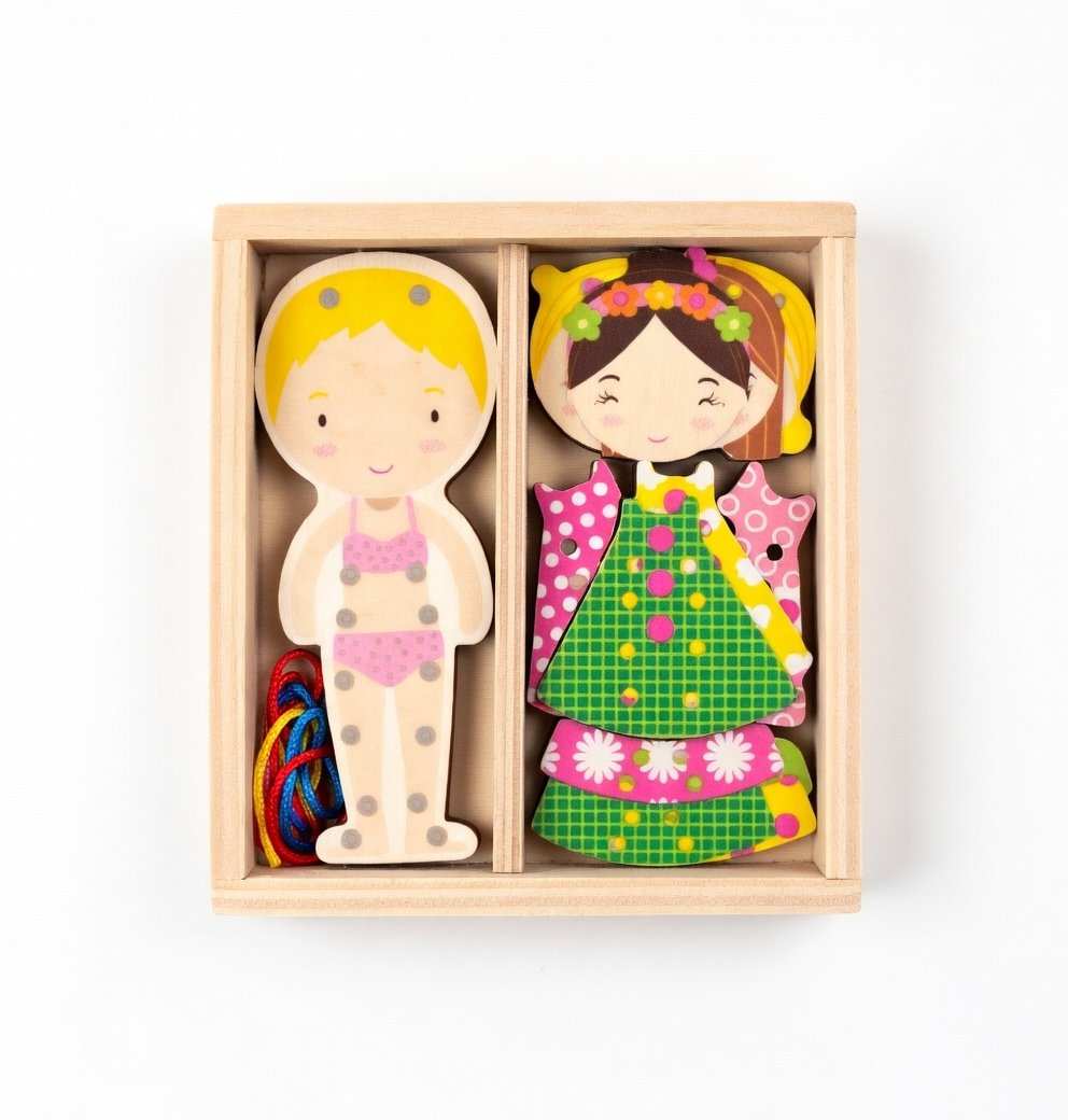 El Lacing Girl de Madera es un material didáctico clásico rediseñado para la estimulación de la motricidad fina.